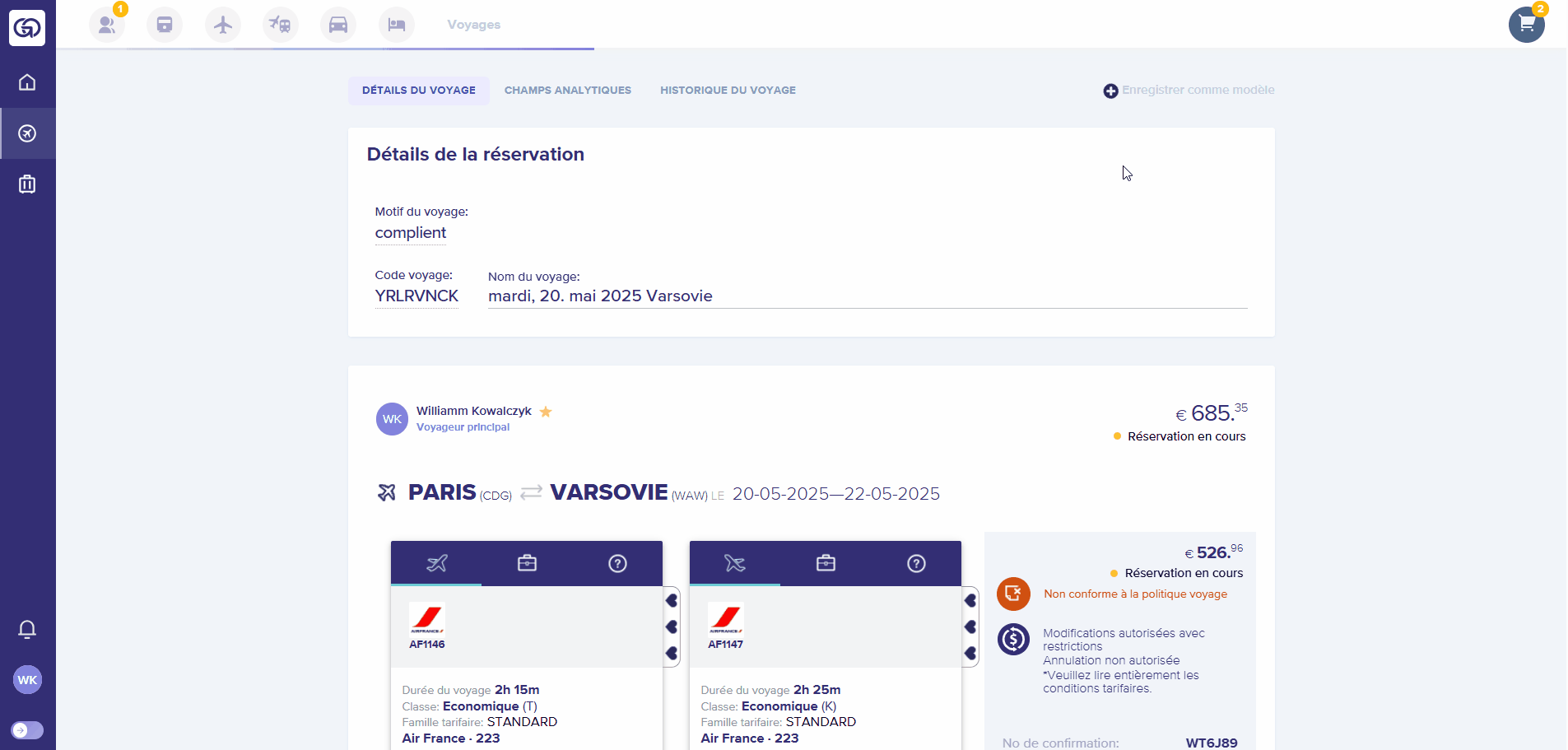 Une fois votre panier prêt (vol, hôtel, voiture), cliquez sur « Enregistrer comme modèle ». Donnez-lui un nom (ex. : Déplacements Paris siège) et retrouvez-le dans Mes voyages → Modèles.
