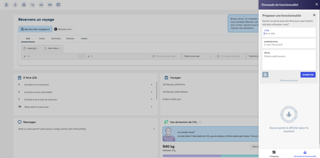 En effet, les utilisateurs peuvent désormais soumettre directement leurs suggestions de fonctionnalités et contribuer à l’évolution de notre plateforme de gestion des voyages d’affaires.